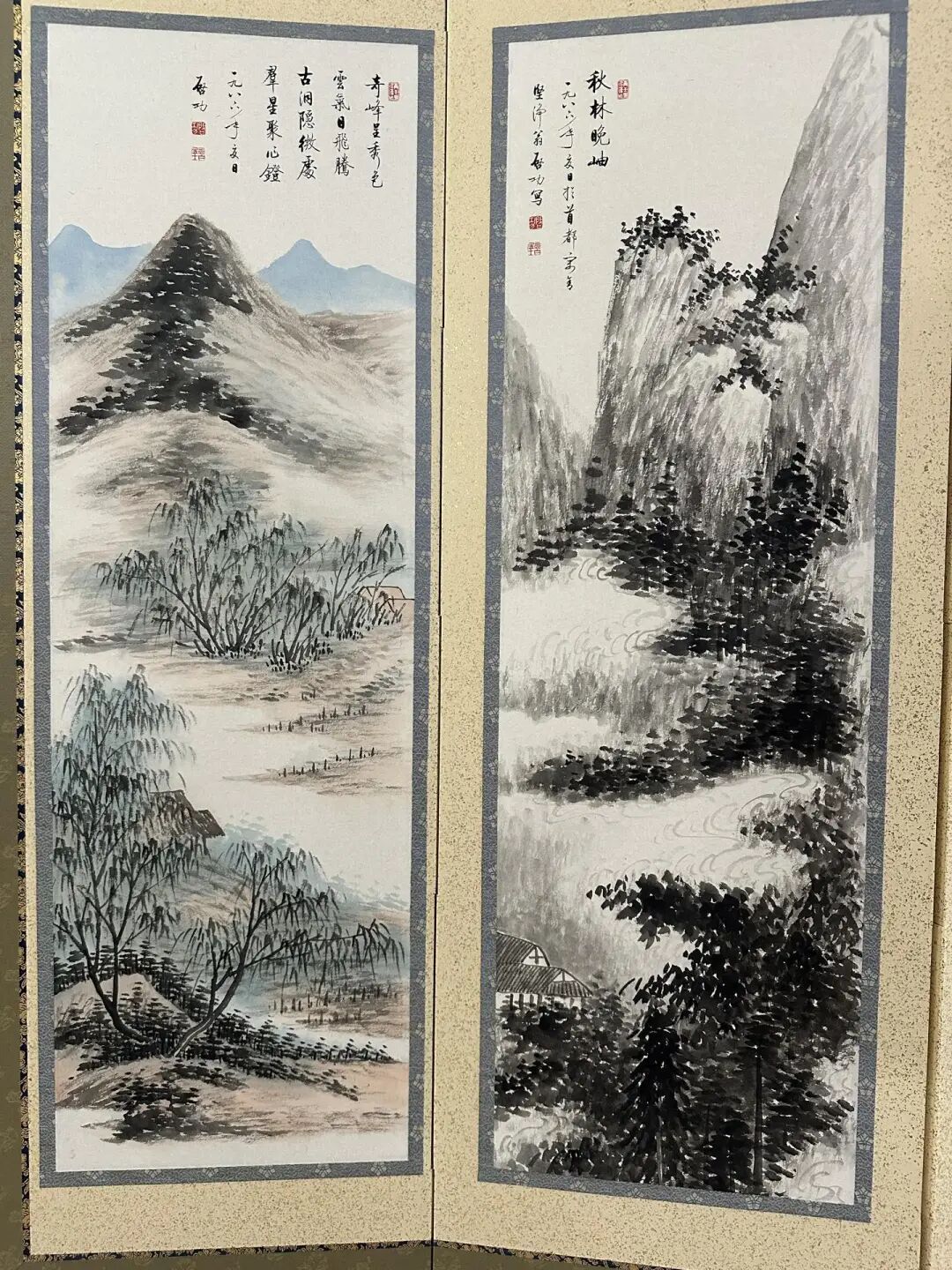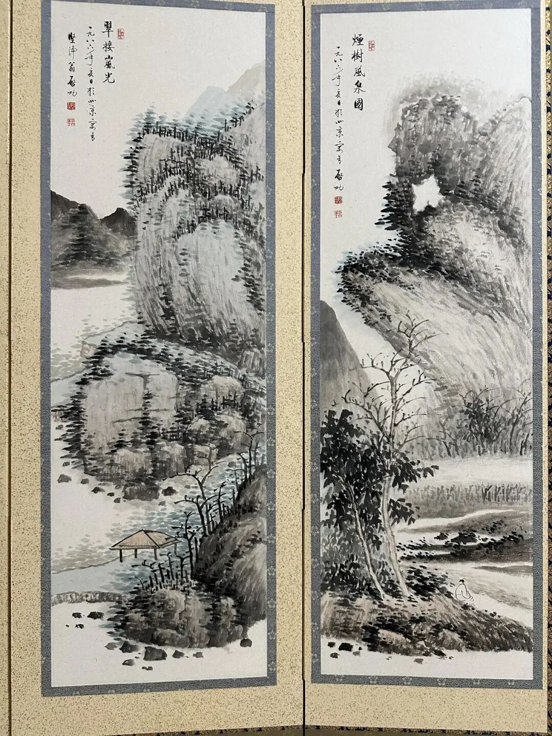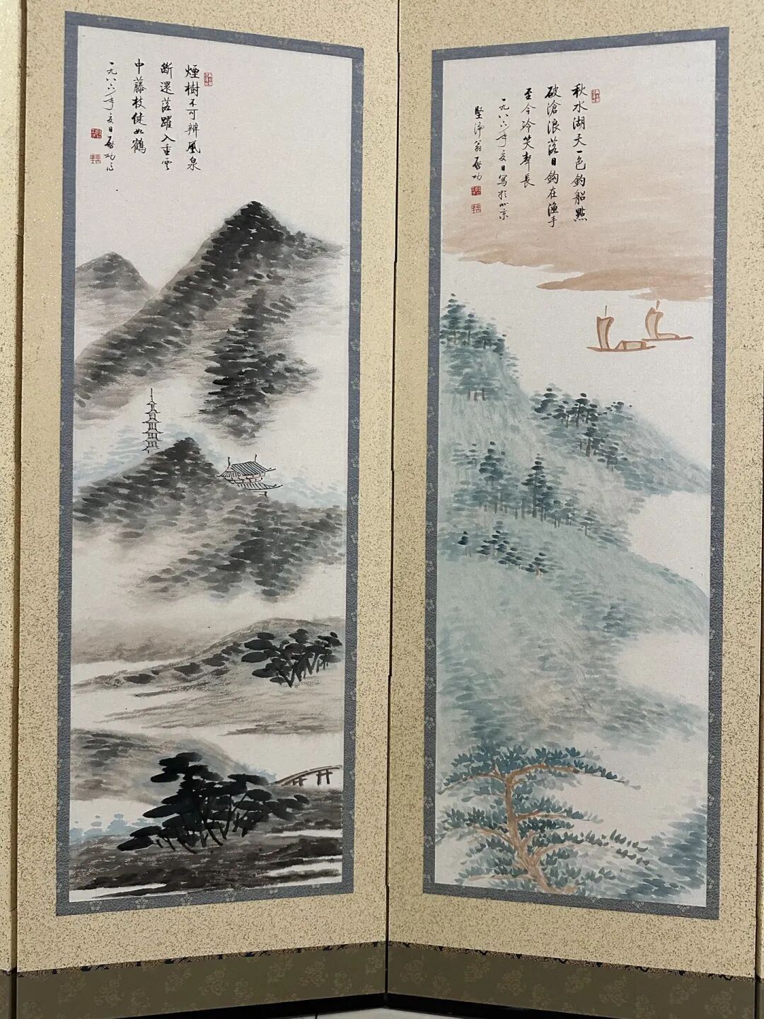 树是疏疏的,水是淡淡的,云气留白,空而不飘,虚而不浮。每一扇都自成小景,远山近水,茅亭孤舟,拼在一块儿,又是一整片可游可居的天地。