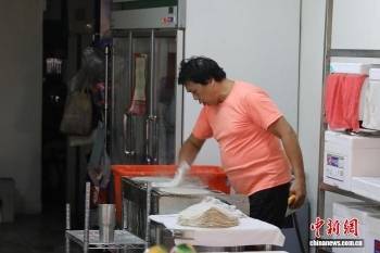 4月1日,台北吴兴街市场内,“阿弘润饼卷”店的老板陈和锦制作润饼饼皮。中新社记者 刘大炜 摄