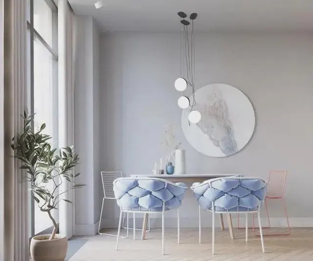 对面餐厅餐桌、餐椅、吊灯、装饰画文艺感十足,淡蓝色餐椅颜色治愈,看着心情愉悦。每天尝试做饭并享用自己的成果,很幸福。