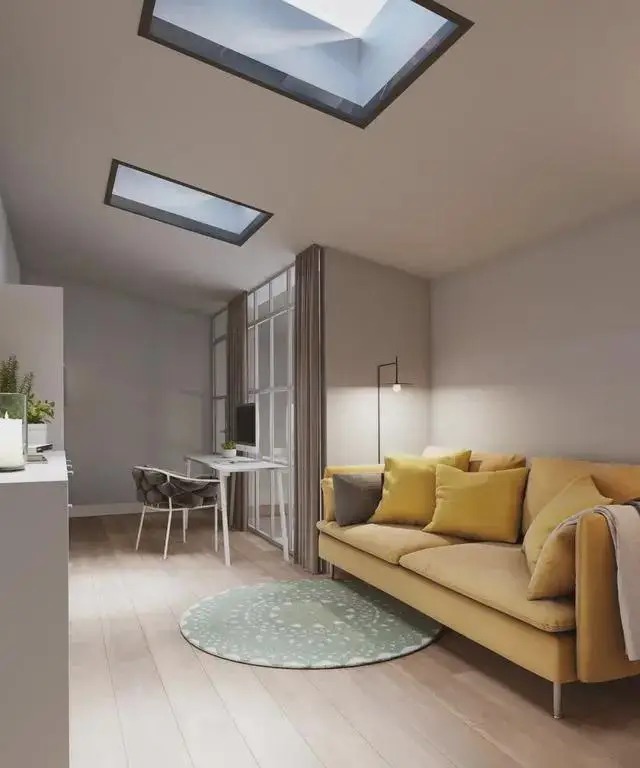 看完一楼,来看看二楼!二楼更能体现色彩之美。二楼客厅选了黄色沙发、淡绿色小地毯。晚上坐沙发上可透过天窗看天空、看星星,浪漫至极。