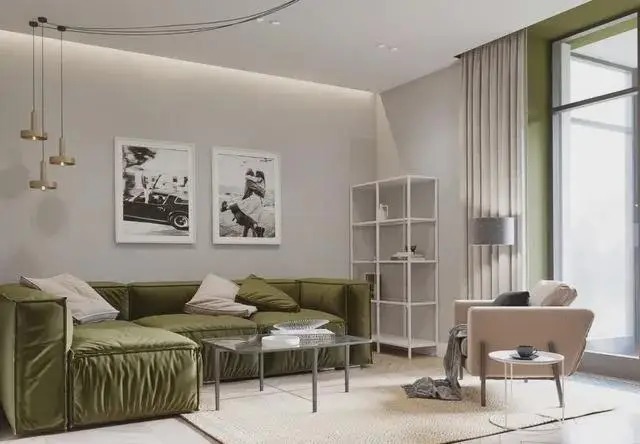 餐厨区对面是客厅,绿色沙发、黑白装饰画、吊灯、沙发、茶几色彩搭配和谐。落地窗让窗外光与自然景融入屋内,使客厅更显宽阔。