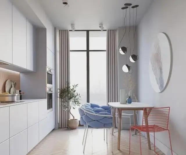 客厅一侧是封闭式厨区,纯白色橱柜简约干净,旁边落地窗和绿植增添生气,若有这样的厨房,会爱上做饭吧。