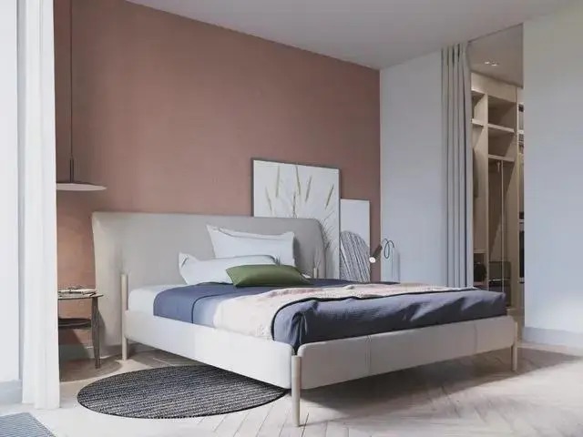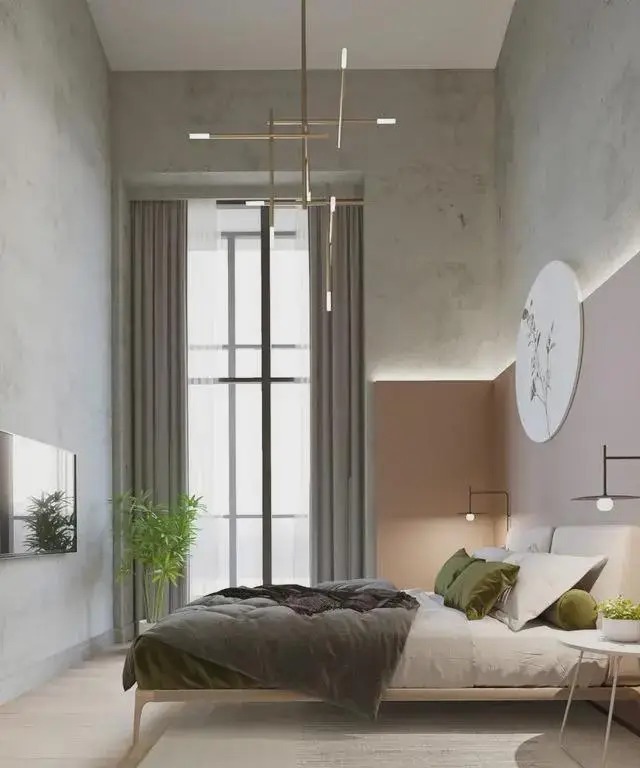 60㎡面积不大,但女业主希望有宽敞卧室,所以设计成挑空式。工业水泥灰与柔和豆沙色结合和谐,家具、配饰选择让卧室温馨。