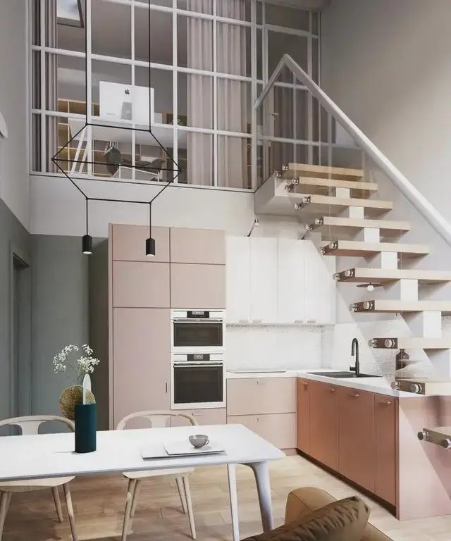 这套房子是复式的,一楼设有厨房、餐厅、客厅和一个卧室。